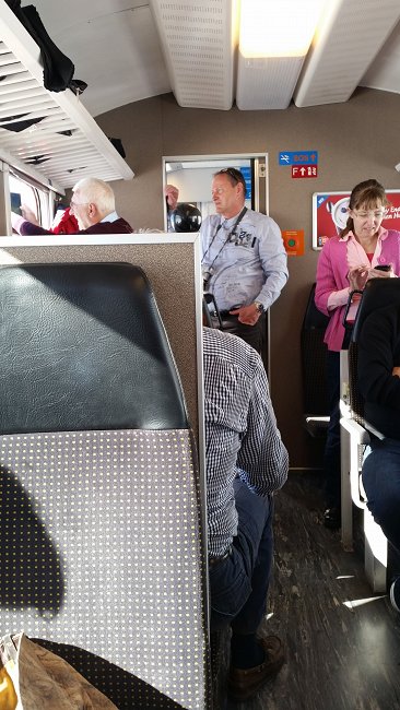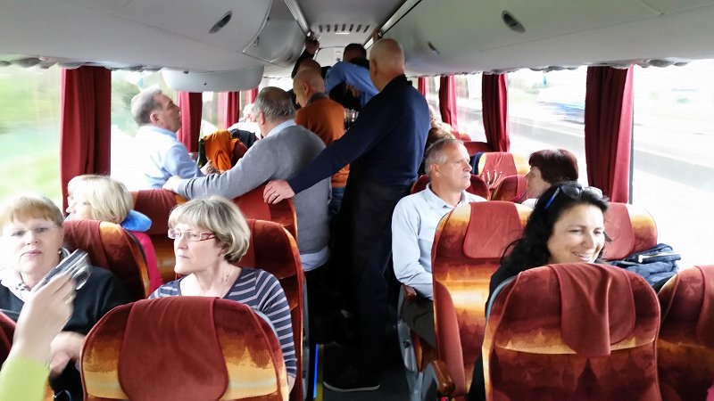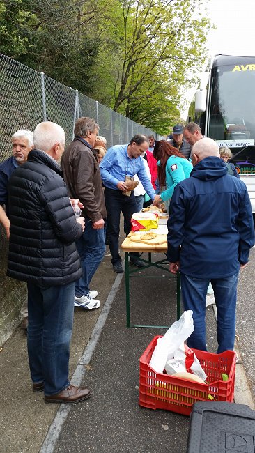 Ponudba osredotočena na del avtobusa okrog hladilnika. Ne manjka tudi šalam. Do oddaljenih delov avtobusa ponudba ne seže. Postanek in malica za vse ! Tudi penina. Nato veselo naprej. Zaplet na meji – brez vinjete ne gre !