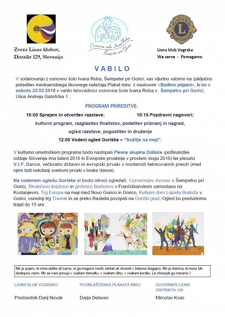 V sodelovanju z osnovno šolo Ivana Roba, Šempeter pri Gorici, vas vljudno vabimo na zaključno prireditev mednarodnega likovnega natečaja Plakat miru z naslovom »Bodimo prijazni«, ki bo v soboto 23.03.2019 v veliki telovadnici osnovne šole Ivana Roba v Šempetru pri Gorici, Ulica Andreja Gabrščka 1 .