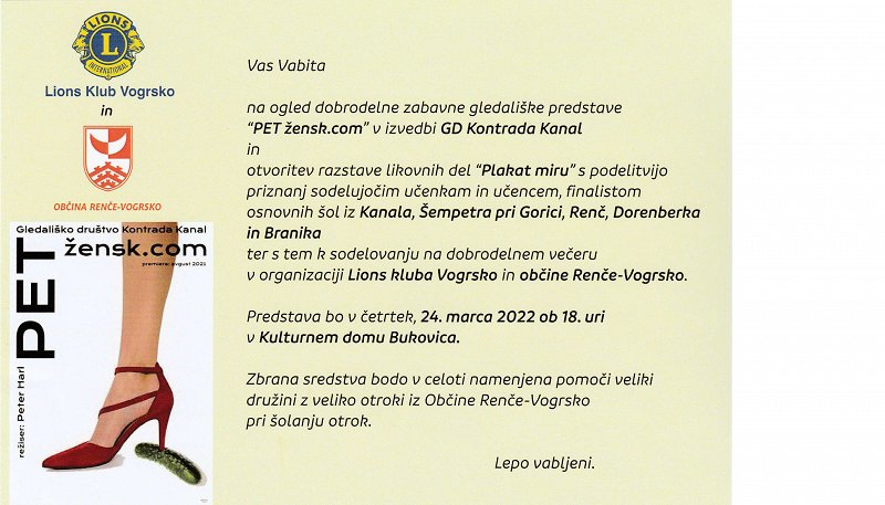 Lions Klub Vogrsko in Občina Renče Vogrsko Vas vabita na ogled dobrodelne gledališke predstave