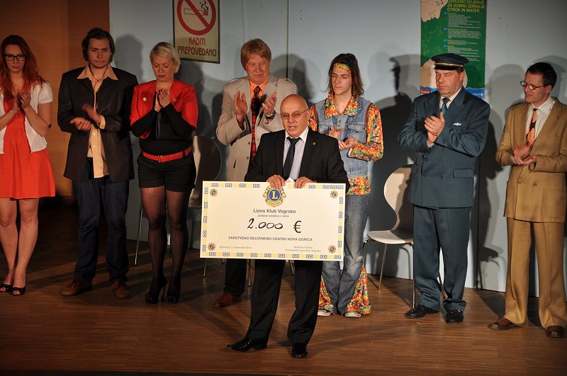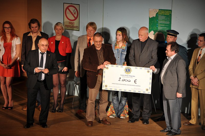 Gledališka predstava  v izvedbi gledališke skupine Kontrada je na šaljiv način predstavila kako nebogljeni in zmedeni smo moški, ko pričakujemo naraščaj. Kljub temu, da so nastopali sami amaterji nas je njihova igra pritegnila,kontrada - gledališka predstava,  tako da smo v predstavi lahko resnično uživali. Ob tej priliki bi se jim radi še enkrat zahvalili za njihov prispevek na naši dobrodelni prireditvi. Sama prireditev je še enkrat potrdila naš plemeniti namen pomagati pomoči potrebnim.Ob velikem številu gledalcev in izredno prijetnem vzdušju je naš predsednik Radovan Pušnar predal  direktorici ge. Tei Leban ček za 2000 eur, ki smo jih s prostovoljnimi prisprevki zbrali ta večer.  Ga Direktorica nam je v kratkih črtah orisala kaj delajo in kakšni so njihovi načrti za naprej, Tako smo se lahko še enkrat prepričali, da smo zbrana sredstva namenili za pravo stvar in pravim ljudem, ki natančno vedo kako in kaj.