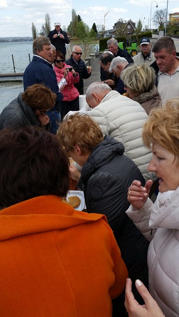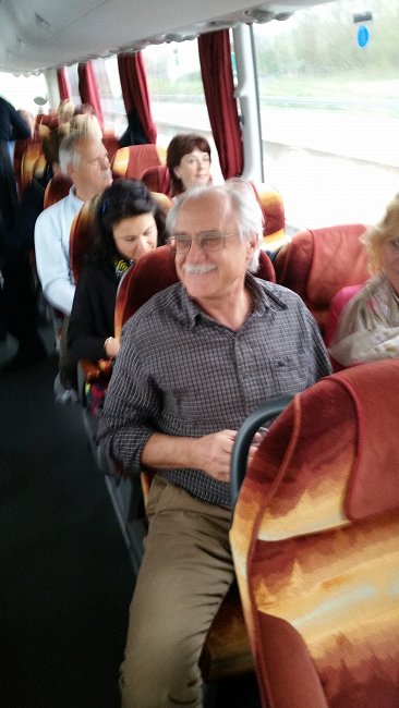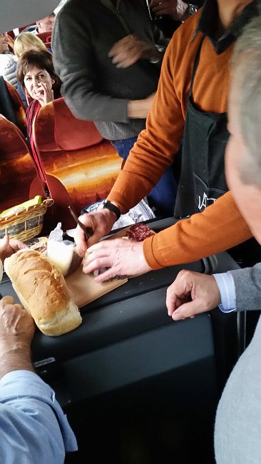Ponudba osredotočena na del avtobusa okrog hladilnika. Ne manjka tudi šalam. Do oddaljenih delov avtobusa ponudba ne seže. Postanek in malica za vse ! Tudi penina. Nato veselo naprej. Zaplet na meji – brez vinjete ne gre !