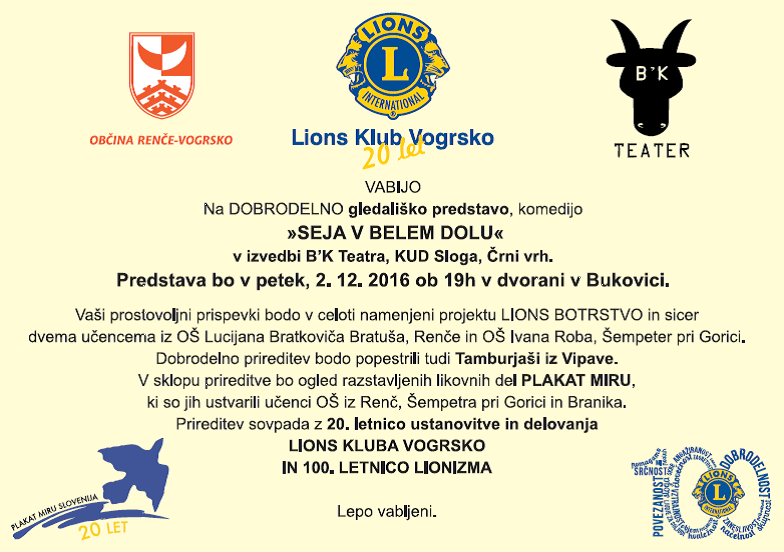 Lions klub Vogrsko vabi na dobrodelno gledališko predstavo 2. decembra 2016 s pričetkom ob 19. uri.