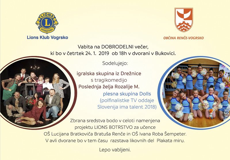 Dobrodelni večer Lions kluba Vogrsko v sodelovanju z Občino Renče Vogrsko v Bukovici, dne 24.1 2019 ob 18 uri.